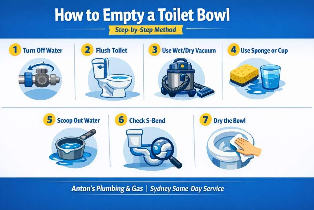 To manually empty a toilet bowl, start by turning off the water supply and flushing the toilet. Use towels or a sponge to soak up any remaining water in the bowl. You can also use a bucket to scoop out water if necessary. For a safer and cleaner approach, consider contacting our team at Antons Plumbing & Gas for expert help.
