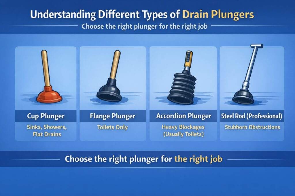 Choosing the right drain plunger makes the difference between a quick clear and repeated, messy attempts that don’t work. Each plunger type is built to seal against a specific drain shape, which is why toilets, sinks, and heavy blockages often require different designs. The table below breaks down the main plunger options so you can match the tool to the fixture and avoid wasted effort.